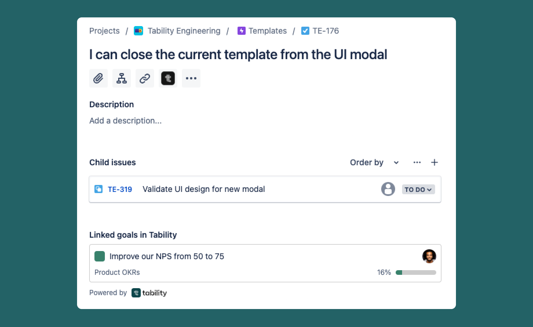 - Keep all data in sync between Tability and Jira (no need to perform actions twice).