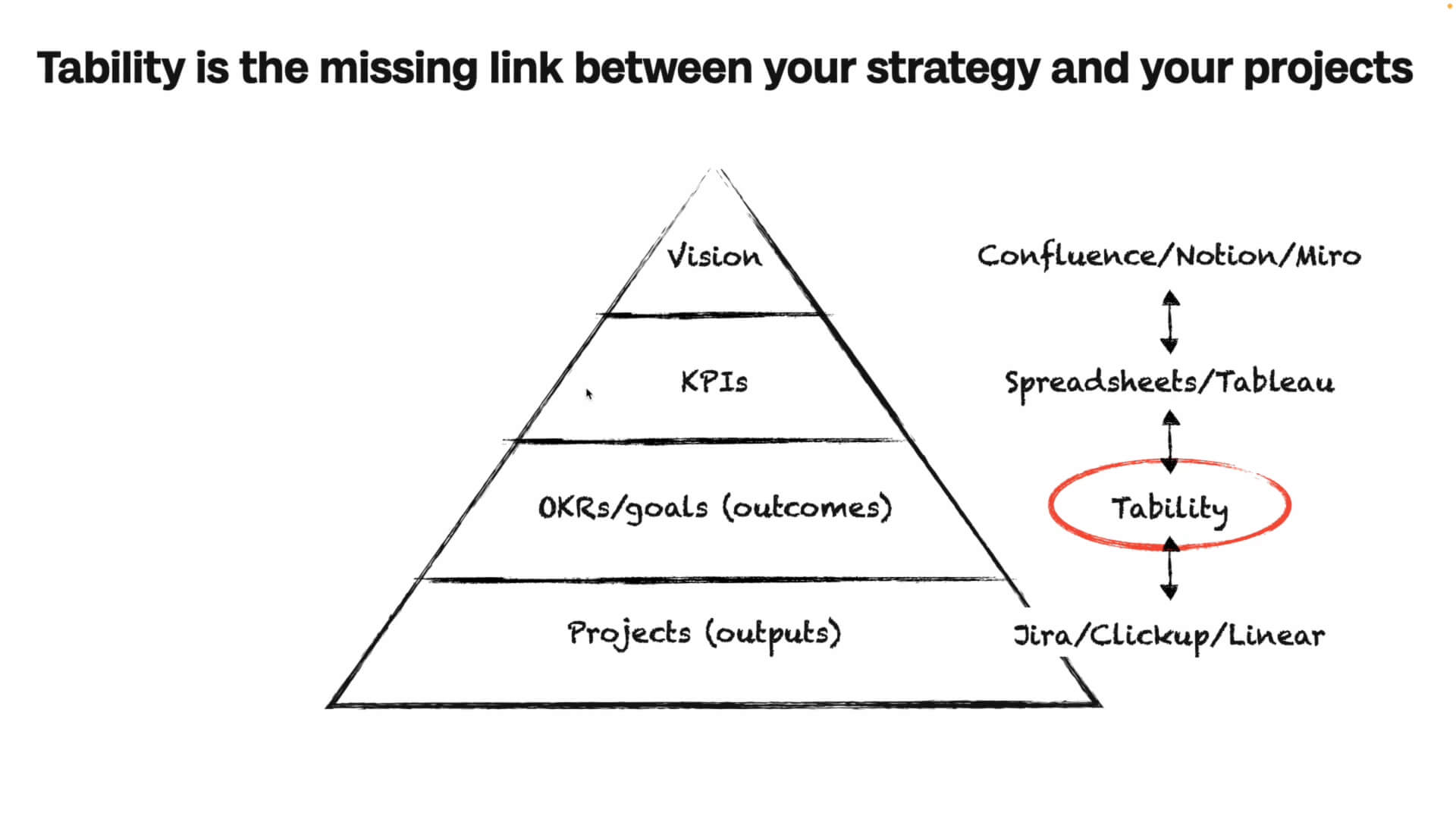 Tability is the tool that sits between your KPIs and your projects. Usually, you have a vision document in a document management system like Confluence, Notion, or Google Docs. From that vision, you build out some success metrics and KPIs in a spreadsheet. At the bottom of the pyramid, you have your projects in Jira, ClickUp, or Linear. For many teams, communication breaks down between KPIs and projects, because KPIs are too high-level and projects are too low-level; your leadership team isn't going to care about every dev ticket, and your devs may not care to read all the vision docs and high-level company health metrics.
