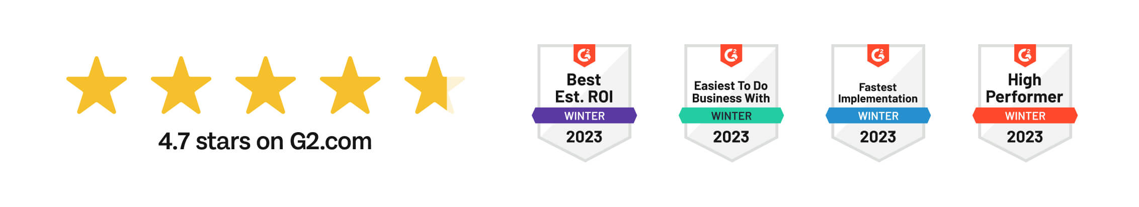 We put a big emphasis on gathering feedback and putting that feedback to use. It put a smile on our face to see that all of your reviews reflect this, as we've received recognition from the G2 community this year Easiest to do Business With, Fastest Implementation as well as Best Est. ROI, High Performer. Thank you all for your reviews.