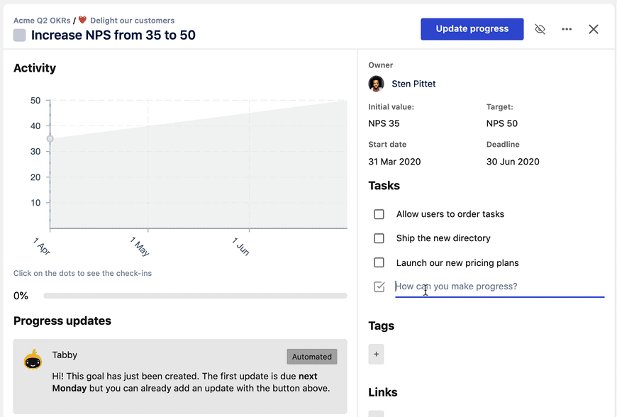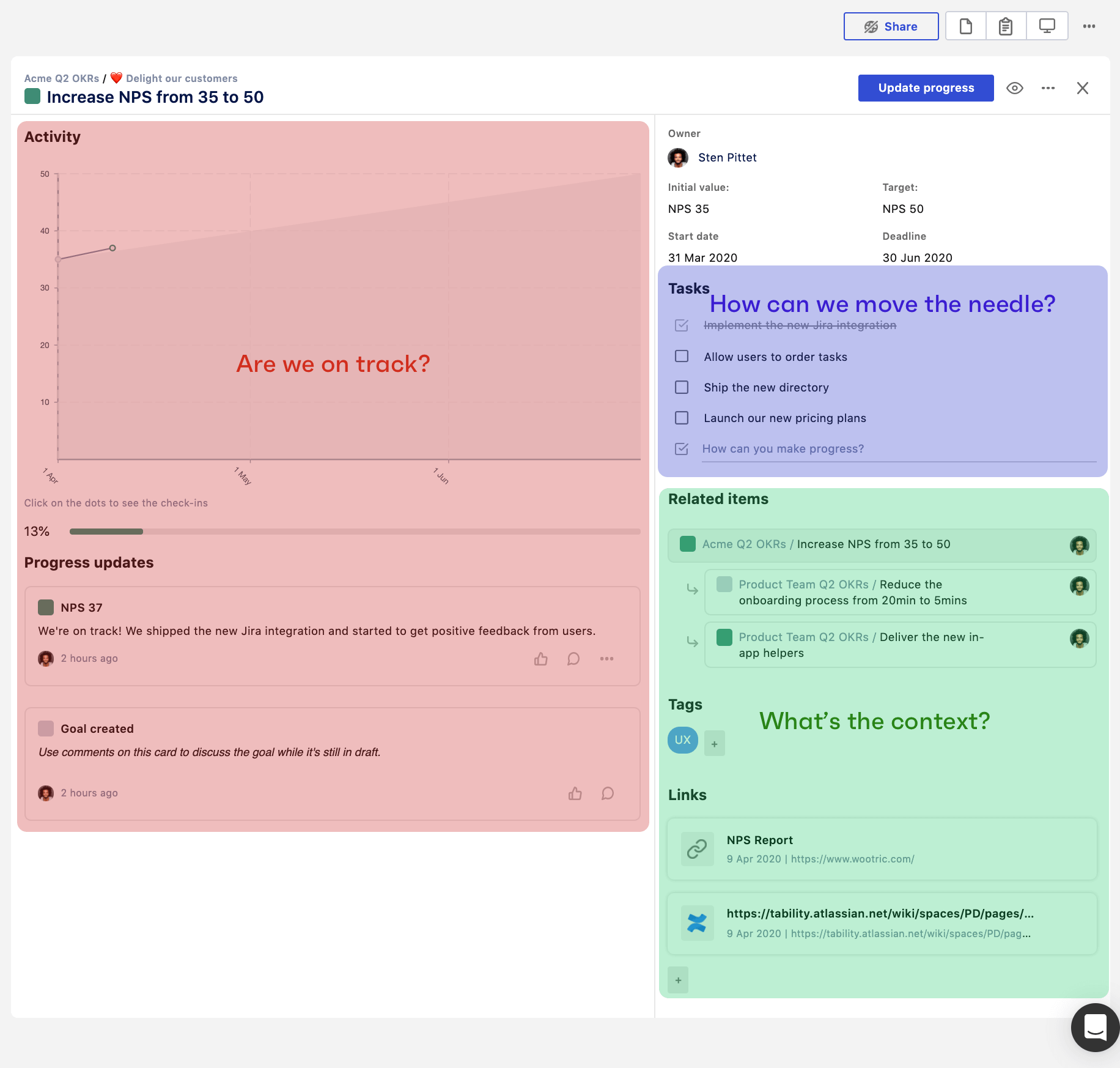 But that's not all! We're also listing other related goals and links in the sidebar to help you get the right context. We designed the goal details view to help you answer the following questions: