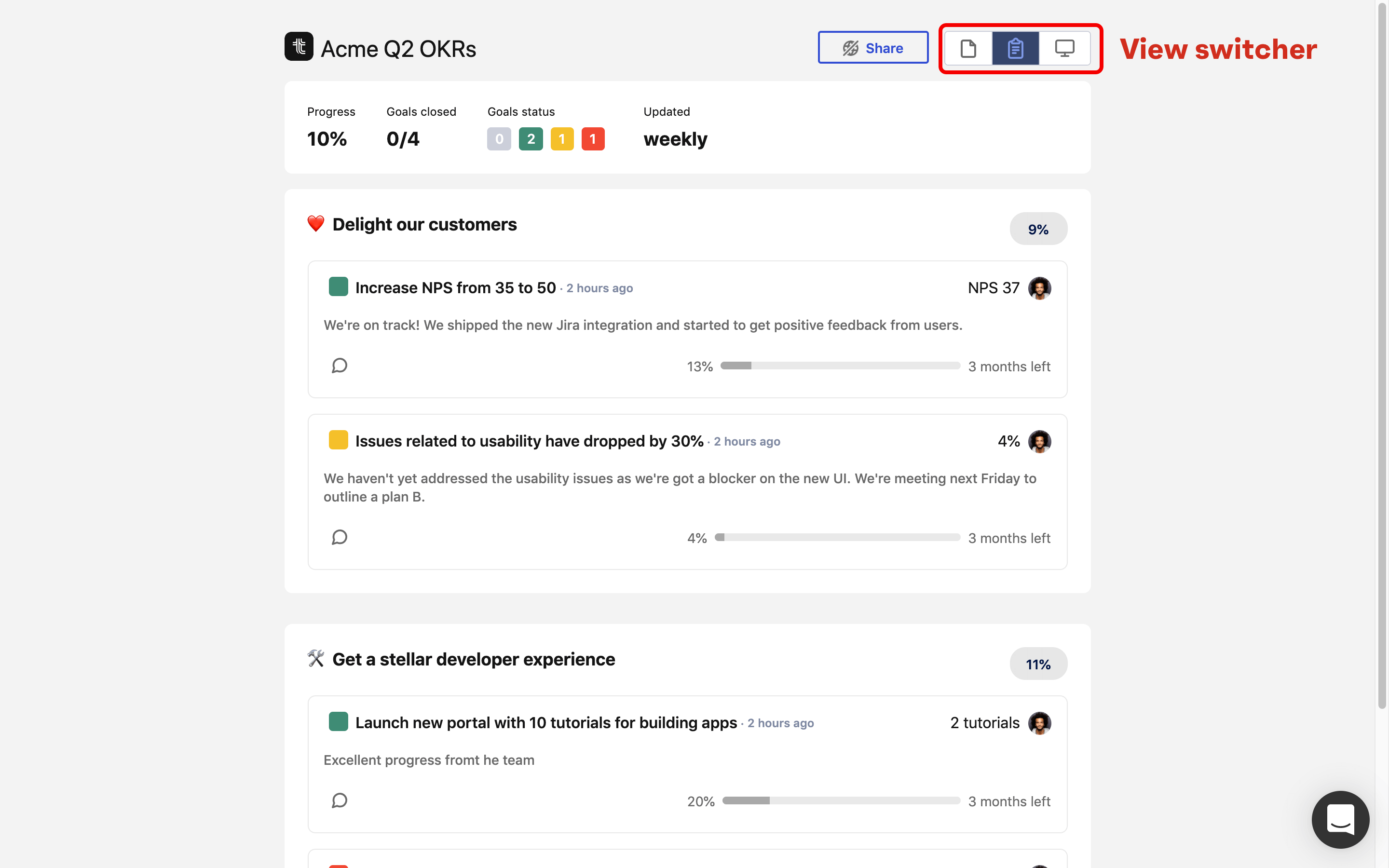 Once you click on a specific page, you'll be able to get into the details of your goals and read the most recent updates. You can also use the view switcher to get a report view optimized for reading.